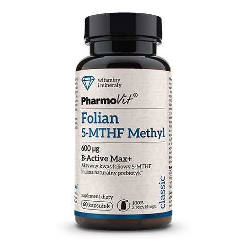 5-MTHF Methyl Folate 600 pg is a dietary supplement containing active folic acid in the form of calcium L-methylfolate. Calcium L-methylfolate is an active, crystalline and methylated form of folic acid that is available to the body immediately after consumption, without the need for further metabolic changes. Contrary to consuming regular folic acid, consumption of calcium L-methylfolate shows greater bioavailability and does not mask vitamin B12 deficiency. *Chicory inulin contributes to the normal functioning of the bowels by increasing the frequency of defecation. Beneficial effects occur with a daily consumption of 12g of chicory inulin. A serving of the product provides 260 mg of inulin. The folates contribute to the growth of maternal tissues during pregnancy, they help in the normal production of blood and the synthesis of amino acids, contribute to the reduction of tiredness and fatigue and are involved in the process of cell division. The folates also help in the proper functioning of the immune system and in maintaining normal psychological functions.