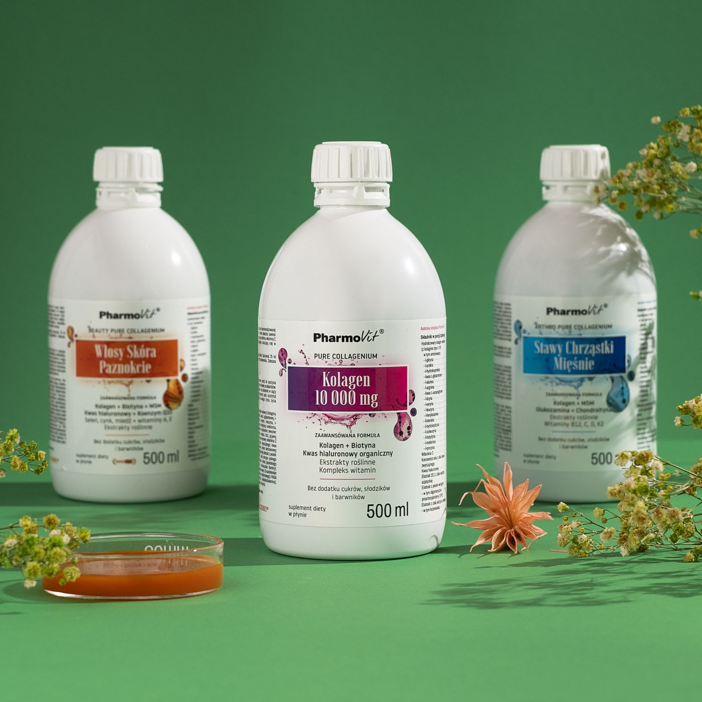 Kolageny 500 ml to linia płynnych suplementów diety opartych na różnych źródłach kolagenu, w tym kolagenie wołowym i rybim. Formuły zostały opracowane z myślą o zróżnicowanych potrzebach i zawierają dodatkowe składniki, takie jak witaminy, minerały oraz substancje aktywne, które uzupełniają codzienną dietę.
