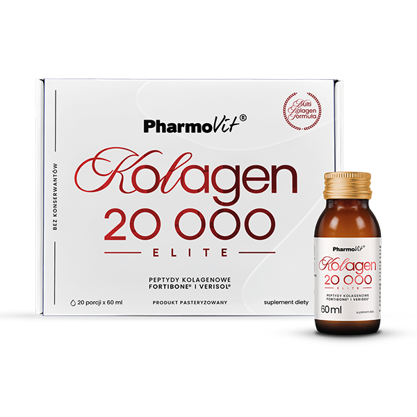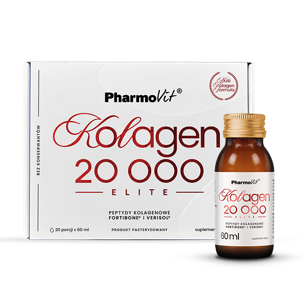 Kolagen 20 000 ELITE to suplement diety w płynie. Produkt zawiera aż 20 g hydrolizowanego kolagenu wołowego, w tym przebadany klinicznie kolagen FORTIBONE®, kolagen VERISOL® oraz witaminę C. Kolagen jest białkiem występującym w ludzkim organizmie. Stanowi główny składnik tkanki łącznej. Wchodzi w skład nie tylko skóry, ale również kości i stawów. Witamina C pomaga w prawidłowej produkcji kolagenu w celu zapewnienia prawidłowego funkcjonowania skóry, kości, chrząstki oraz ochronie komórek przed stresem oksydacyjnym.